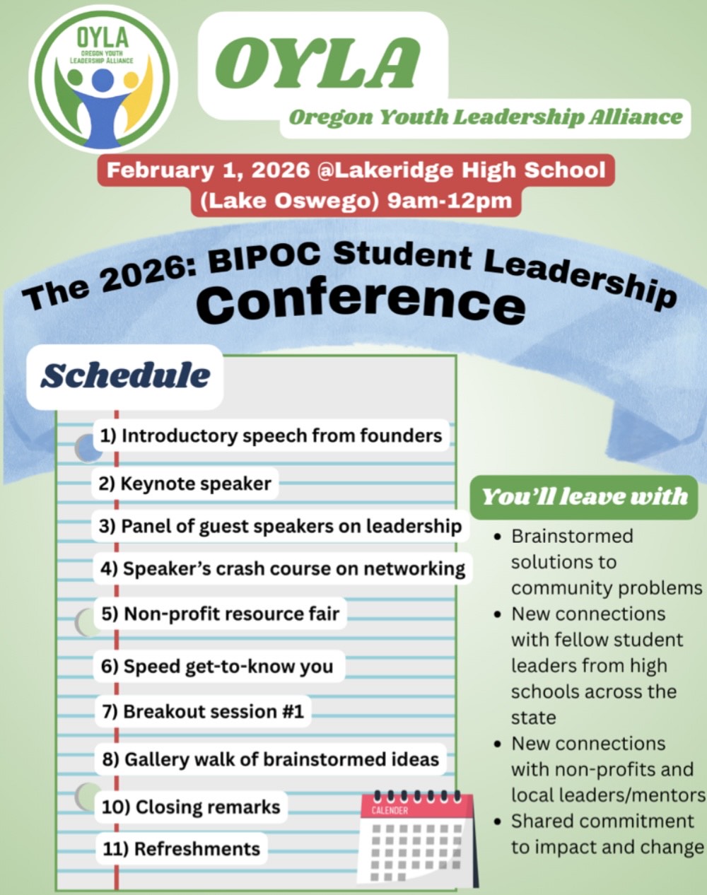 Oregon Youth Leadership Alliance (OYLA) is hosting a BIPOC student leadership conference on Sunday, Feb 1st, 9:00am-12:00pm at Lakeridge High School in Lake Oswego. Details and registration link below: